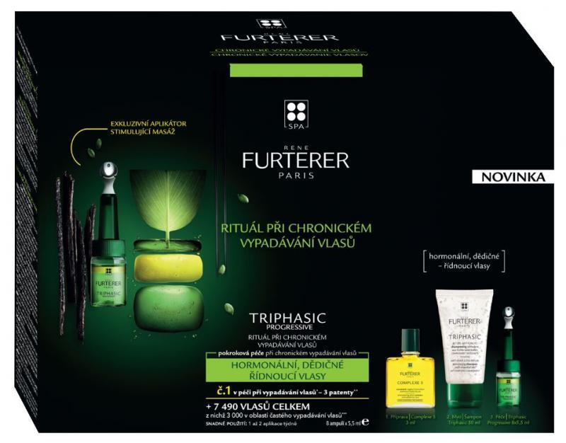 3. René Furterer Triphasic Progressive (8x5,5 ml) - pôsobí na 3 faktory zodpovedné za chronické vypadávanie vlasov (postupné, geneticky podmienené vypadávanie vlasov): cievny (výťažok brazílskeho ženšenu), hormonálny (výťažok z tekvicových semien) a tkanivový faktor (HMC, výťažok z horkého pomarančovníka a stearyl glycyrrhetinát, výťažok zo sladkého drievka). Inovácia v starostlivosti pri vypadávaní vlasov, ATP pôsobí vo vnútri folikulárnej papily zodpovednej za vlasový rast. Už po prvej kúre vlasy vyzerajú silnejšie a vlasová pokožka je menej viditeľná. Podporuje zachovanie množstva vlasov.